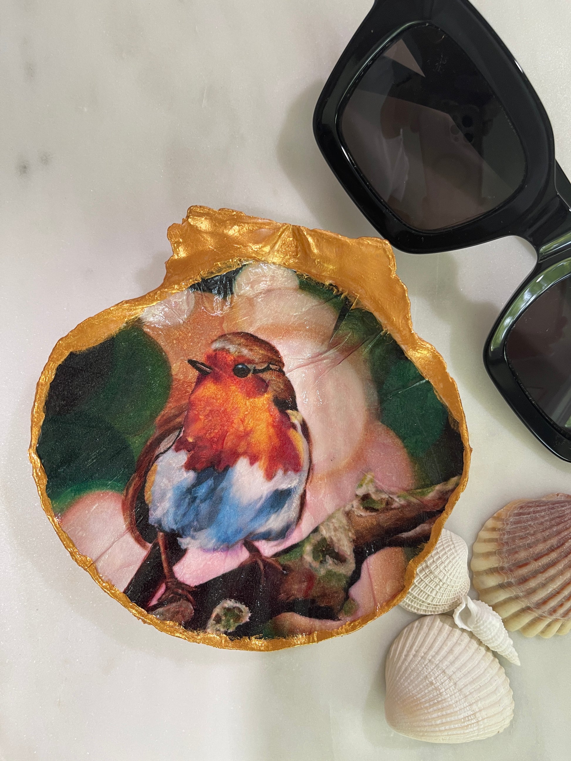 Decoupaged Sea Shell using copies of original artwork painted by Robin Sheehy! Real sea Shell measuring 4.5" x 4.5" finished in a metallic gold edge! Great gift for the hard to buy love one! Ready to ship!
