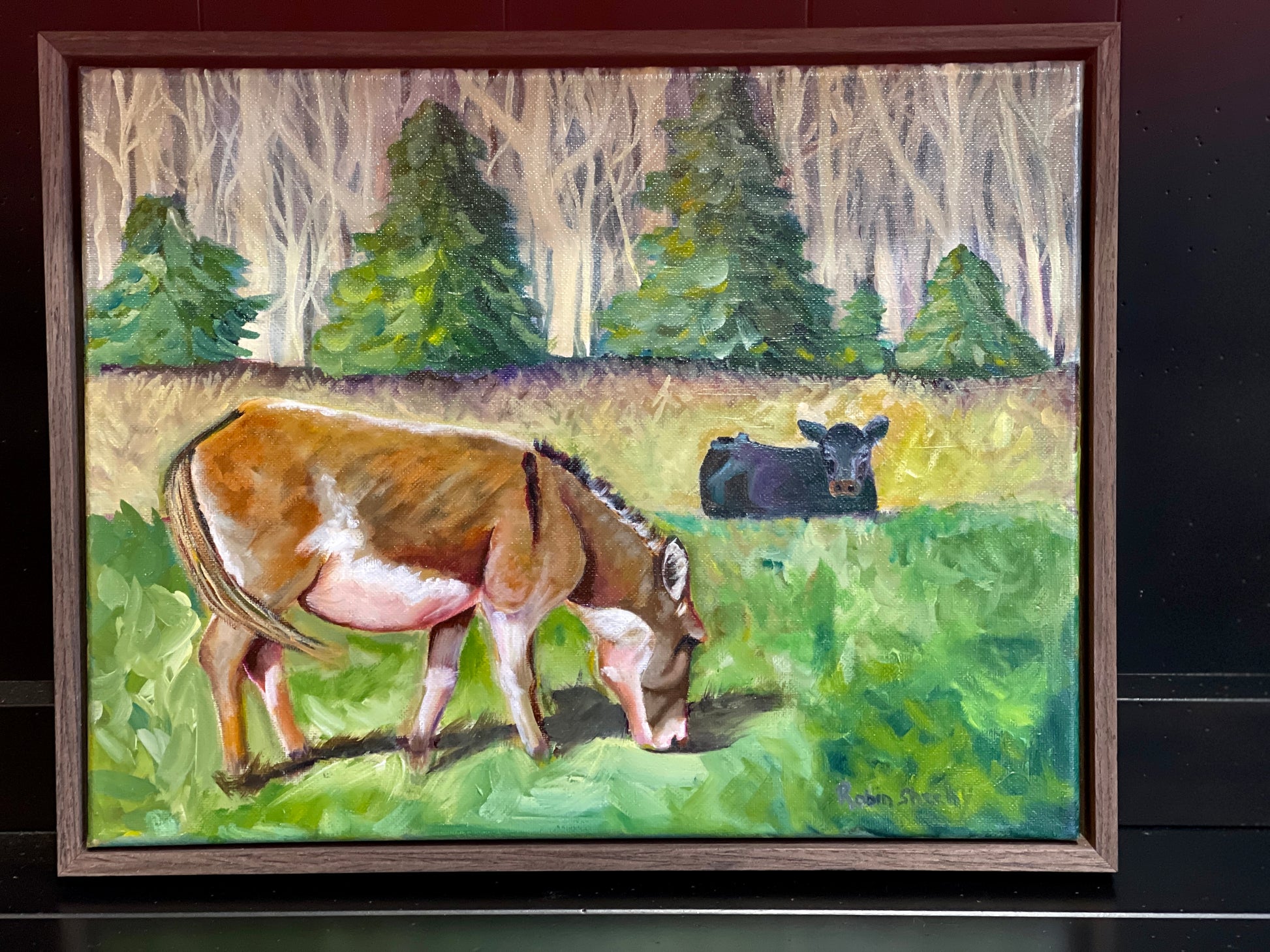 My neighbor has a herd of cattle! Rather than using a dog to protect the herd, they use Donkeys. Donkeys are very loyal, and will protect the herd from predators. I wanted to acknowledge these goofy looking brave and loyal fur babies! Photo was taken in the fall when most of the leaves have left the trees. Oil on Canvas 11 x 14 framed and ready to ship!