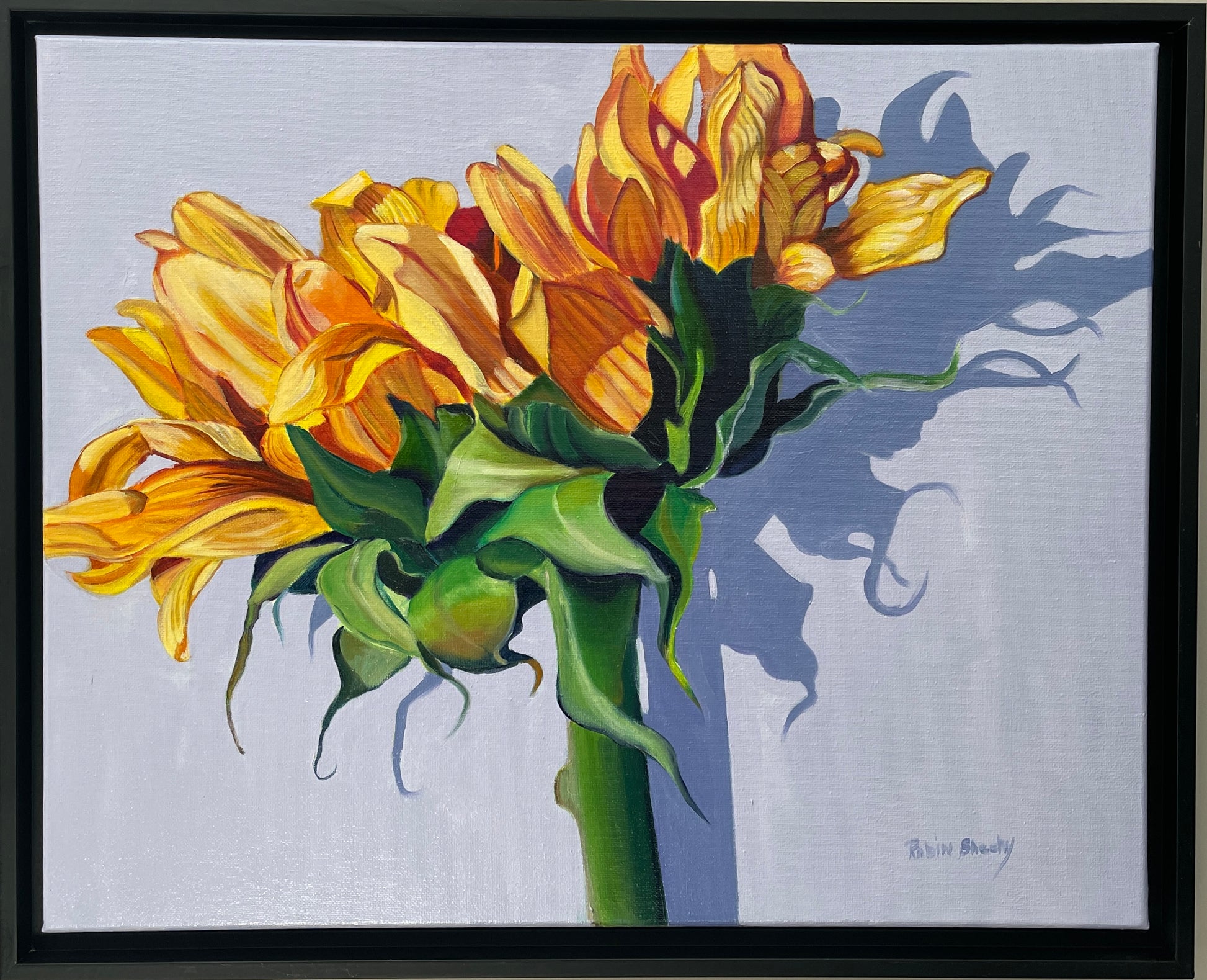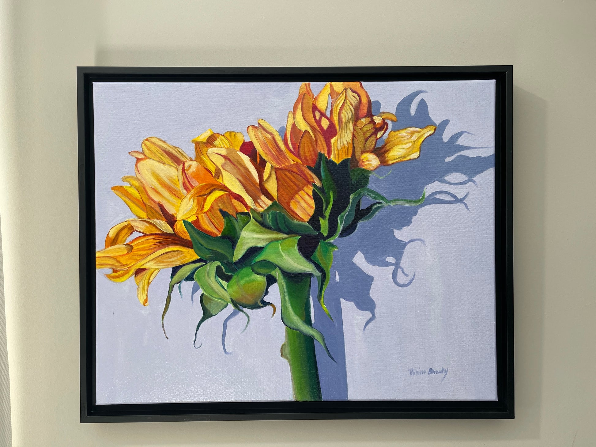 A celebration of nature’s quiet drama—this radiant sunflower study captures the moment just before full bloom. Golden petals twist toward the light, casting graceful shadows that dance across a soft backdrop. Painted in rich warm hues with lifelike detail, it brings a feeling of warmth, resilience, and timeless elegance.