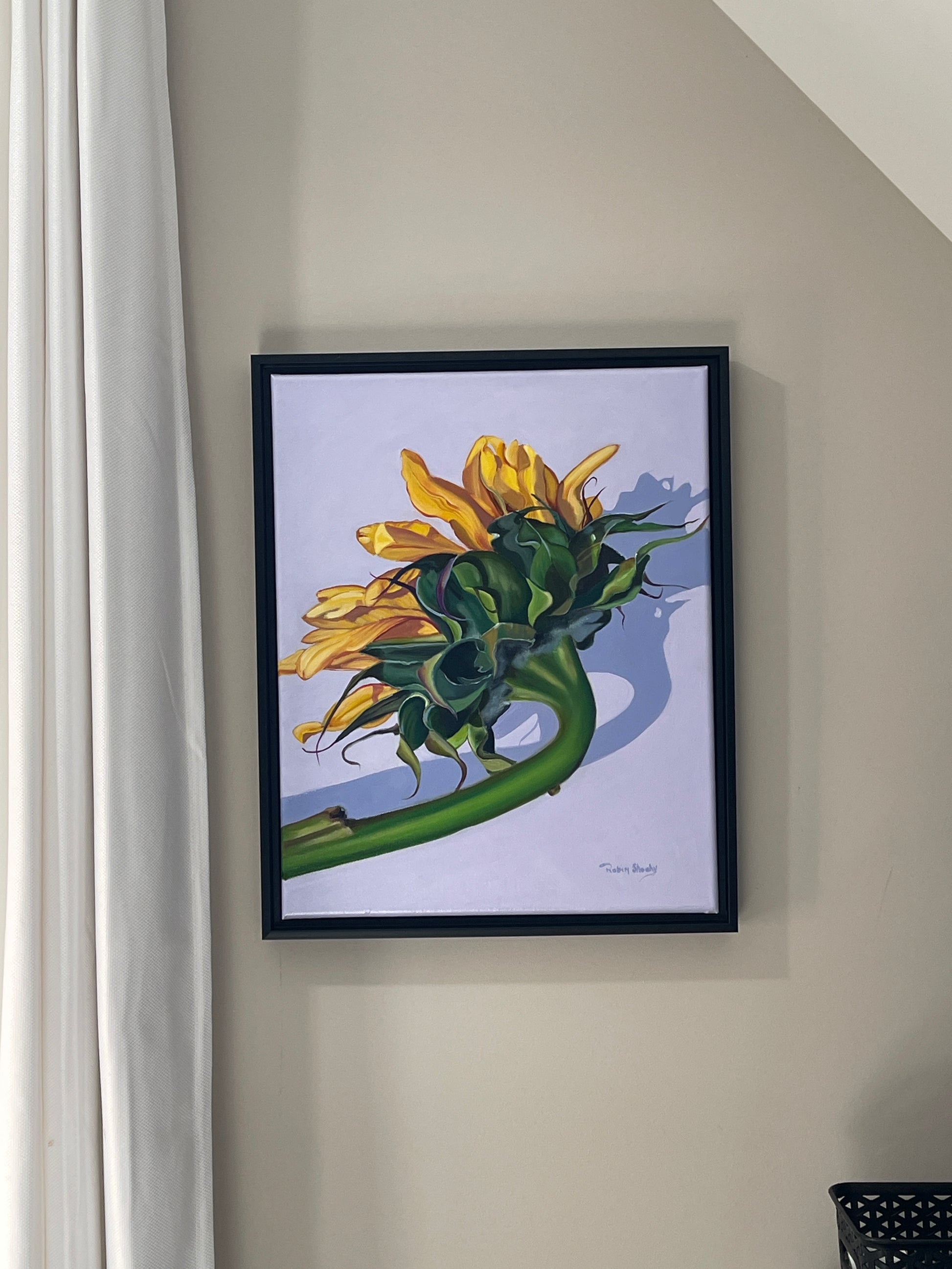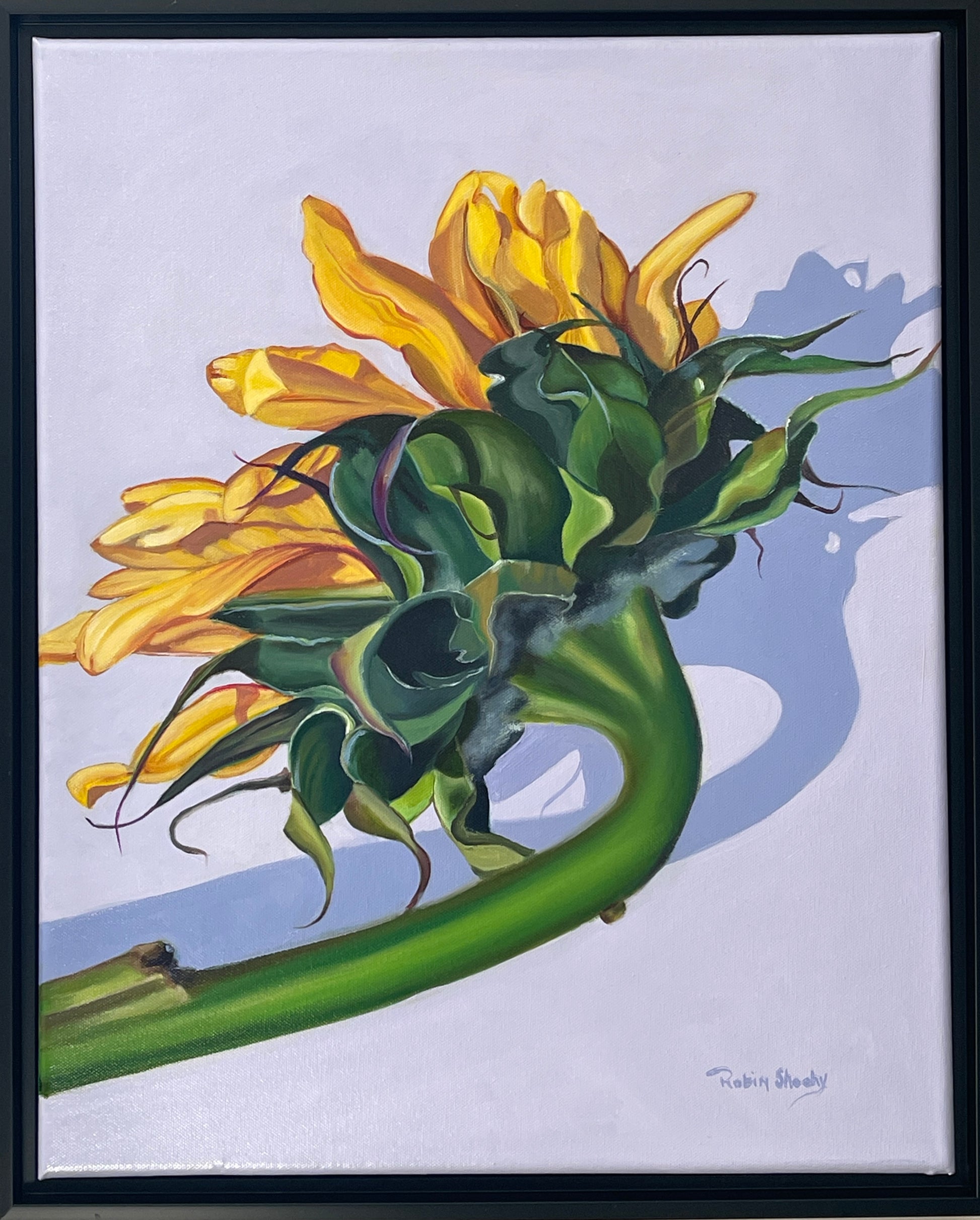This vibrant sunflower portrait captures the quiet strength and elegance of nature, painted from an intimate angle that highlights the flower’s graceful curve and sunlit petals. Rich greens and golden yellows glow against a soft, lavender-tinted background, creating a striking yet soothing balance of color and light. The contemporary realism and sculptural movement of the leaves give the piece emotional depth—evoking resilience, growth, and optimism. Perfect as a focal point in a living room, entryway, or creative workspace, this artwork brings warmth, vitality, and refined natural beauty to any setting.